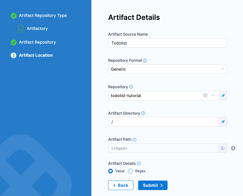 For this example, we'll use a publicly available ToDo List app artifact, todolist.war, available in a public Harness Artifactory repo.