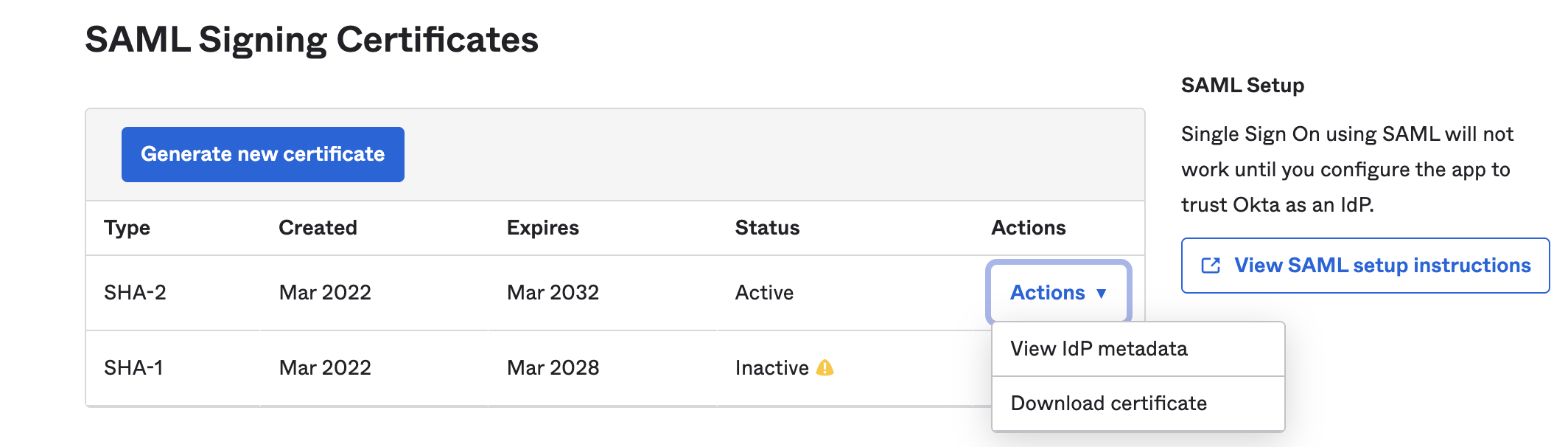 2. Select Actions to view the SAML metadata, then copy that data into a file and save it with an .xml extension.