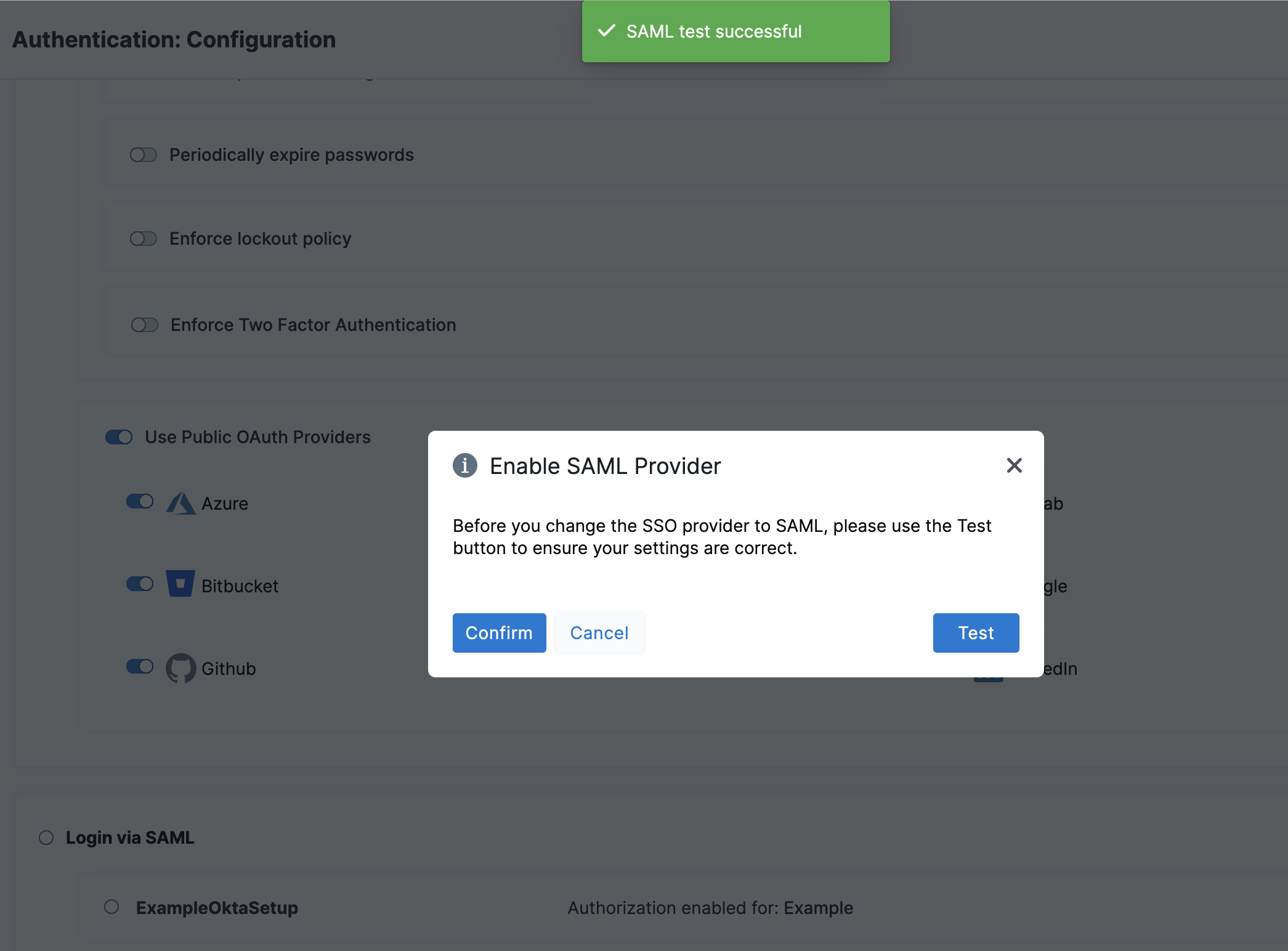 3. On the Enable SAML Provider confirmation window, select Test to verify the connection. A new browser tab opens where you need to log in to Okta.