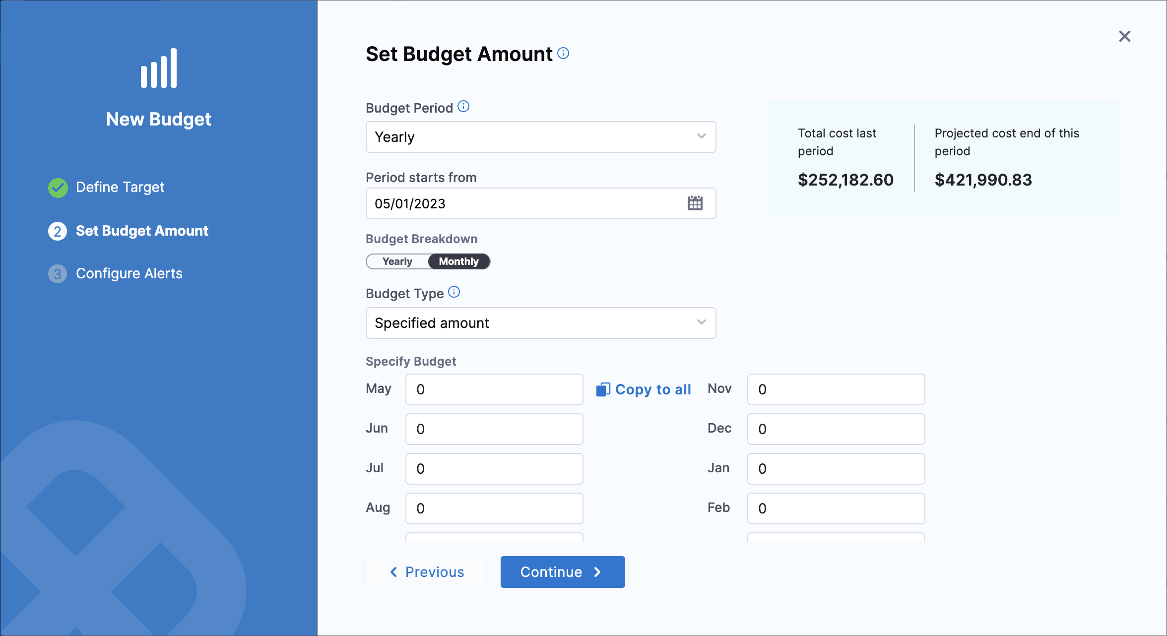 - Clone budgets with customizable options for thresholds and recipients